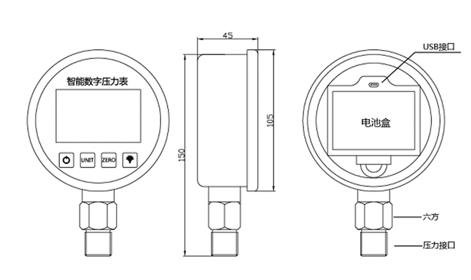 SUAY80智能壓力表是一款高精度智能型數(shù)字壓力表,內(nèi)置高精度壓力傳感器,能夠準(zhǔn)確的實時顯示壓力,并且具有精度高、長期穩(wěn)定性好的特點(diǎn)。配備5位顯示的大尺寸LCD液晶顯示,具有清零、背光、開關(guān)機(jī)、單位切換、低電壓報警、峰值記錄等多種功能,操作簡單,安裝方便。殼體和接頭采用304不銹鋼,抗震性好,能夠測量氣體、液體、油等對不銹鋼無腐蝕的介質(zhì)。用3節(jié)5號電池供電,也可以采用USB供電,續(xù)航功耗低、時間長,適用于便攜式壓力測量、設(shè)備配套、校驗設(shè)備等壓力測量領(lǐng)域。